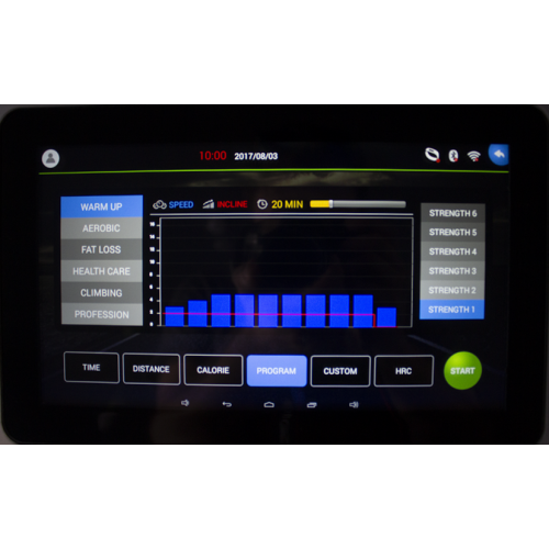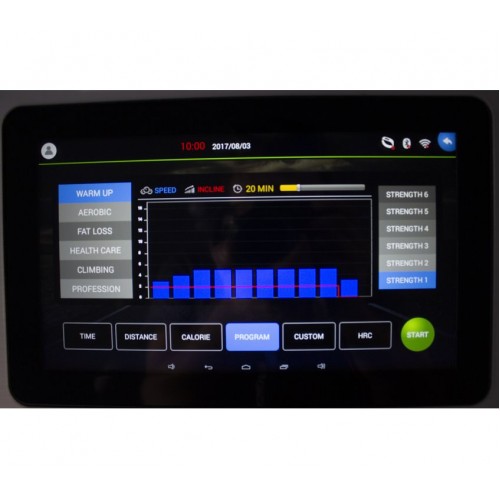 Мощная конструкция тренажера в сочетании с широким беговым полотном 58 х 145 см и допустимой нагрузкой до 120 кг гарантирует максимальный комфорт при выполнении упражнений. Компьютер тренажера имеет 3 целевые программы, 6 предустановленных программ с 6-ю уровнями нагрузки, 1-ну пульсозависимую и 5 мануальных программ которые позволяет вам настроить программу обучения в соответствии с вашими потребностями. Так же есть 3 сцены- визуальная имитация бега. 10.1 дюймовый TFT экран отображает всю необходимую информацию во время тренировки, такую как скорость, расстояние, время, пульс, сожженные калории и угол наклона бегового полотна.