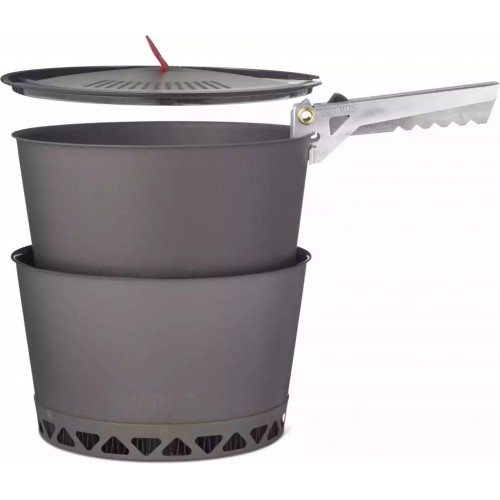 PrimeTech Pot Set разработаны с целью эффективного использования топлива. Основной котел снабжен теплообменником, в нижней части, что увеличивает на 50% его эффективность по сравнению с другими котлами. Это означает, что ваша вода будет закипать быстрее и ваше топливо будет расходоваться меньше. Основной котел сделан из прочного анодированного алюминия и имеет керамическое антипригарное покрытие на внутренней стороне, что облегчает приготовление пищи и мытье котла. Дополнительный котел сделан из натурального анодированного алюминия и имеет традиционную конструкцию без теплообменника.
