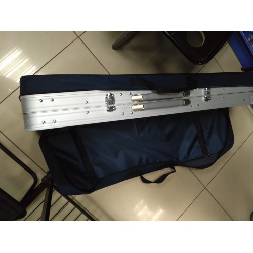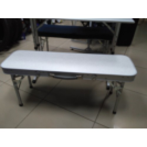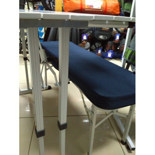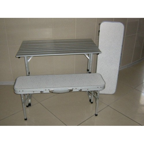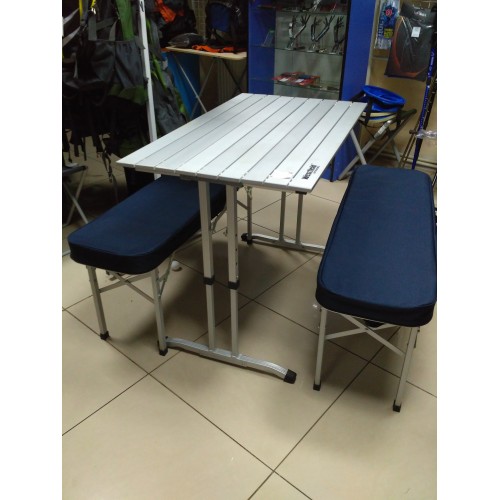 Скамейки являются створками чемодана, в который при транспортировке укладывается складной стол. Столешница состоит из пластин алюминиевого профиля. Скамьи сделаны из столешниц мдф в алюминиевом профиле. Чехол выполнен из плотной ткани, которые служат сидениями на скамейки. Даже в холодную погоду будет комфортно отдыхать.