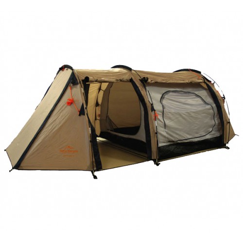 4-х местная двухслойная комфортная палатка. Каркас - 3 дуги. Герметичные швы, дышащий материал спальни, противомоскитные сетки, возможна установка тента без спальни. 2 входа в спальню, большая прихожая с дополнительным входом. Возможна трансформация входов в навесы.