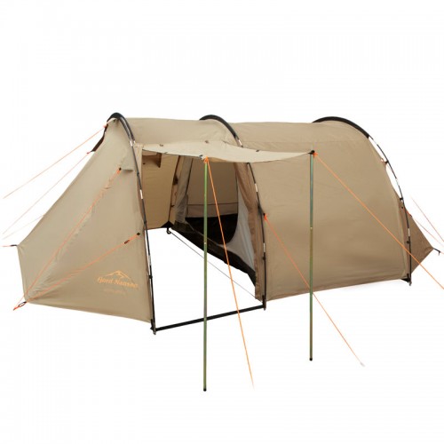 4-х местная двухслойная комфортная туристическая палатка. Каркас - 3 дуги. Герметичные швы, дышащий материал спальни, противомоскитные сетки, возможна установка тента без спальни. 1 вход в спальню, большая прихожая. В палатке имеется множество карманов для удобного хранения различных мелочей. Возможна трансформация входа в навес.