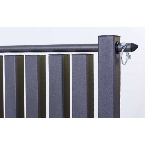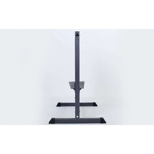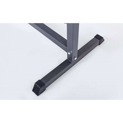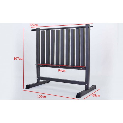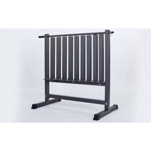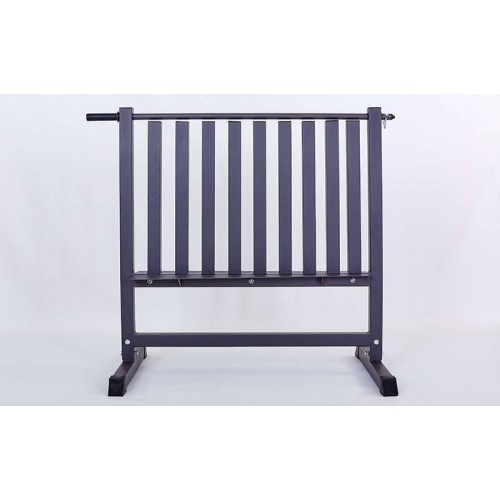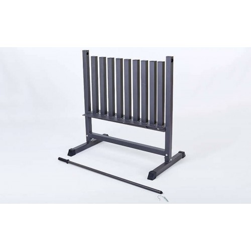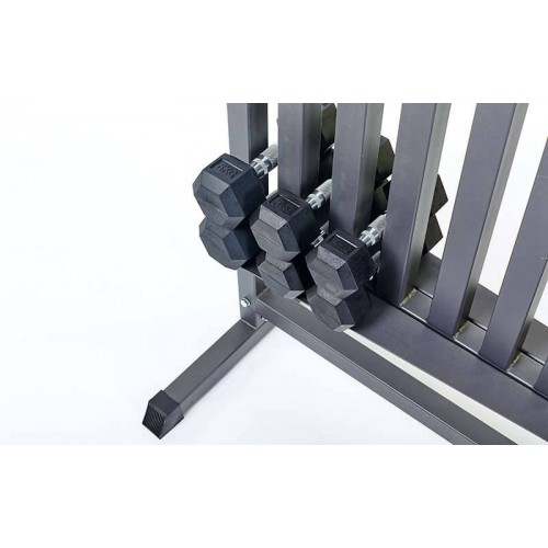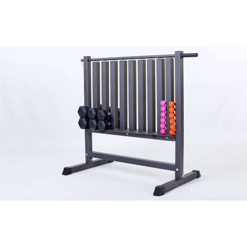 Цельнометаллическая стойка имеет вертикальную раму, разделённую на десять секций, что позволяет эффективно хранить большое количество гантелей. Изготовленная из квадратного профиля, она похожа на радиатор отопления, установленный на широкие массивные ножки, которые обеспечивают ей максимальную устойчивость. Пластиковые насадки на ножках позволяют при необходимости передвинуть подставку, не оцарапав пол спортзала. Особенностью конструкции является то, что размер секций меньше чем головки гантелей, поэтому уложить их можно только сверху. При этом верхняя запорная планка с возможностью закрыть её на замок полностью исключает возможность хищений.