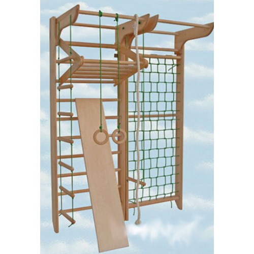 Другое преимущество – это параллельное размещение шведской стенки и гладиаторской сетки, что дает возможность маленькому спортсмену перемещаться не только вверх-вниз, а и в стороны, перебираясь из стенки на сетку и наоборот. Сверху стенки и сетки размещены стационарные турники, которые имеет особый вид крепления, что обеспечивает устойчивость и надёжность при занятиях спортом. В комплект также входит навесное оборудование – канат, кольца, верёвочная лестница и трапеция гимнастическая, которое развешивается на турниках. Занятия на навесных элементах прекрасно тренируют мышцы рук, спины, вырабатывают правильную осанку, а также станут отличным развлечением малышу. Спортивный комплекс имеет благородный цвет натурального дерева, что делает его незаменимой частью любого интерьера.