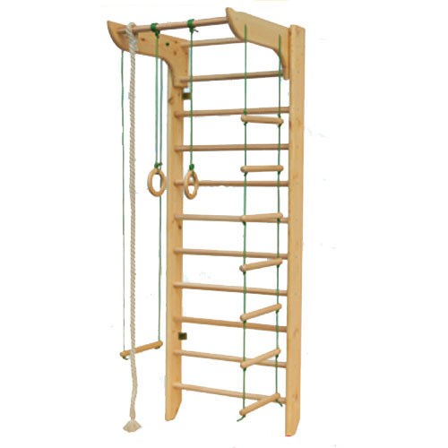 Детский спорткомплекс снабжён сверху стационарным турником, уникальная конструкция которого не имеет аналогов, достаточно компактна и позволяет с лёгкостью проводить комплекс физических упражнений даже взрослому человеку. Перекладины шведской лестницы имеют диаметр 3,5 см, что является оптимальным для такого вида спорткомплексов. Лазание по лестнице отлично массирует стопы ребёнка, что поможет избежать плоскостопия. В комплект также входит навесное оборудование, состоящее из – каната, колец, верёвочной лестницы и трапеции. Занятия на таких спортивных элементах отлично тренируют все группы мышц, развивают гибкость, ловкость, улучшают координацию и моторику.