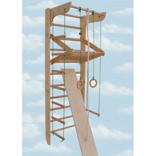 Данный детский деревянный комплекс проходит тщательную шлифовку и покрыт безопасным лаком на водной основе, так что ваш малыш не поранится. Чтобы обезопасить занятия вашего ребёнка на спорткомплексе, рекомендуется приобрести к нему гимнастический мат.