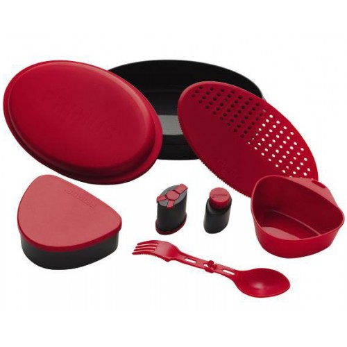 Эргономичный набор разноцветных емкостей и столовых приборов. Своеобразный легкий походный сервиз из пищевого термостойкого пластика. В транспортном положении набор очень компактный, все собирается в миску - контейнер и плотно закрывается крышкой. Пищевой пластик не имеет запаха и не искажает вкус пищи.