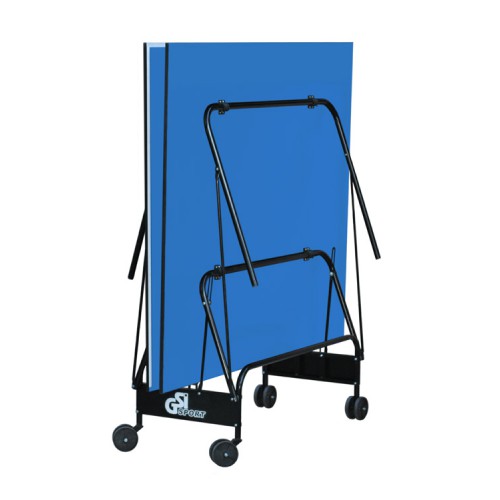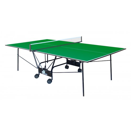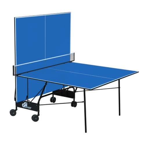Теннисный стол для закрытых помещений. В качестве материала для игровой поверхности используется специально обработанная древесностружечная плита (ДСП) толщиной 18 мм. Игровая поверхность оснащена металлической рамой (прямоугольный профиль 30*20 мм). На ДСП нанесено специальное антибликовое пластиковое покрытие синего цвета. Игровая поверхность оснащена металлической рамой (прямоугольный профиль 30*20 мм). Каждая половина столешницы имеет независимую разборную конструкцию и базируется на четырех складываемых ножках, которые имеют жесткие фиксаторы в игровом положении. Конструкция изготовлена из металлического трубчатого профиля диаметром 25 мм с полиэфирным покрытием. Сетка в комплекте.